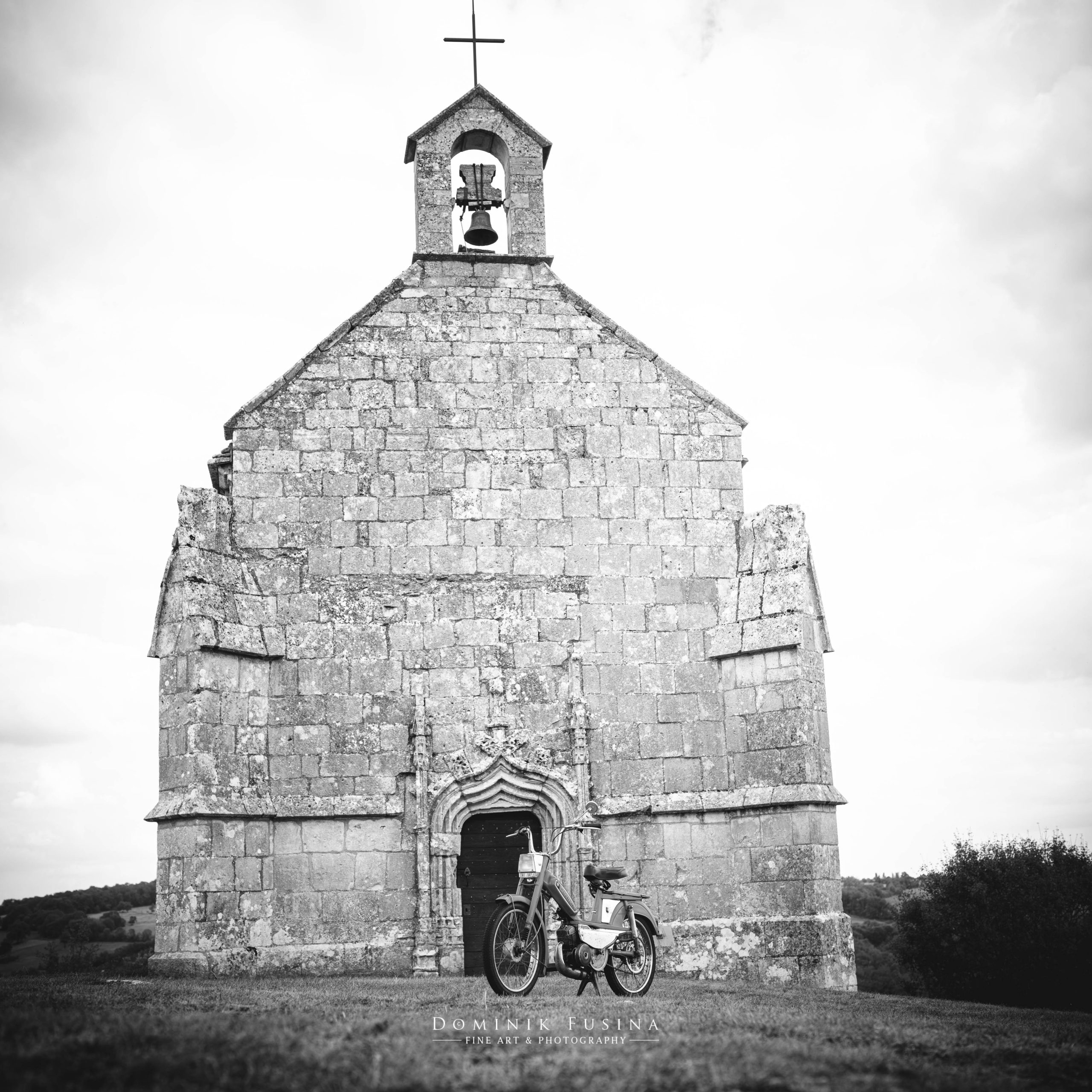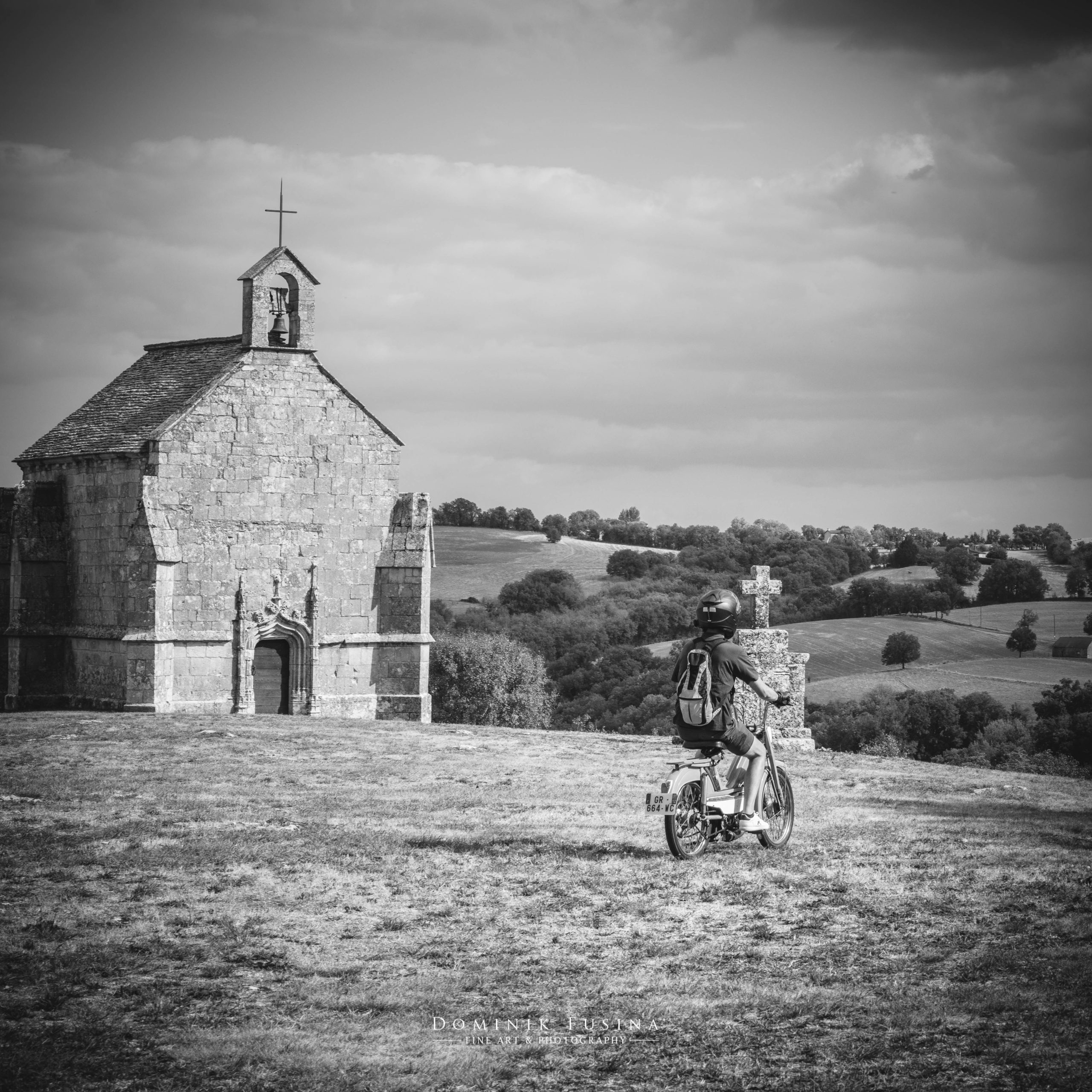 Alors que j’étais en train de photographier la jolie chapelle dans un splendide panorama naturel, j’entends au loin le bruit singulier et reconnaissable d’une vieille mobylette. M’apercevant, le pilote de l’engin se met respectueusement en attente à quelques mètres de moi afin de ne pas me gêner alors que je cadre le monument. Je déclenche puis lui fais signe de passer.