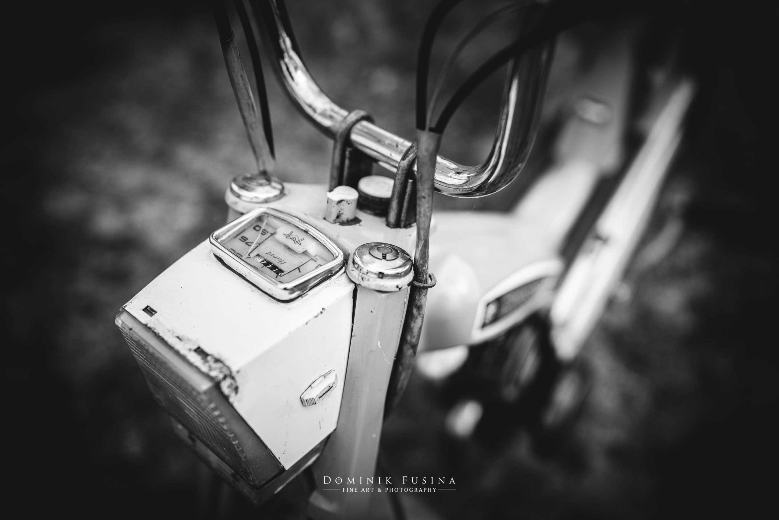 Etonnamment, le motocycliste installe sa mobylette devant la porte de la chapelle et se met à la photographier. Même si la démarche m’amuse et m’intrigue, l’engin lui m’inspire encore plus. Pour tout vous dire, dès mes 14 ans, j’avais hérité de la mobylette Cady (une Motobécane également) de ma mère. Je l’avais entièrement démontée, pièces par pièces (au grand dam de mon père qui s’était dit que je ne pourrai m’en sortir sans son aide… alors que finalement non !), puis retapé en récupérant divers éléments d’une seconde. Pour finir, je l’avais repeinte en bleu nuit au lieu de son rouge initial (je crois que c’est mon oncle, peintre carrossier, qui l’avait fait pour moi). Elle faisait du 35-40km/h à tout casser. Enfin, sur du plat, avec le vent en arrière. Malgré cela, comme pour conjurer le sort de son atroce lenteur face aux « 103 » qui me grattaient odieusement, j’avais peint sur le réservoir un cheval ailé doré (pâle copie de l’emblème du ReaderDigest), et l’avais surnommé « Pégase » ! On se prend à rêver parfois qu’un simple nom de baptême peut influer positivement sur ses médiocres performances… Donc autant vous dire qu’en voyant cette vieille motobécane, de nombreux souvenirs ont refait surface.